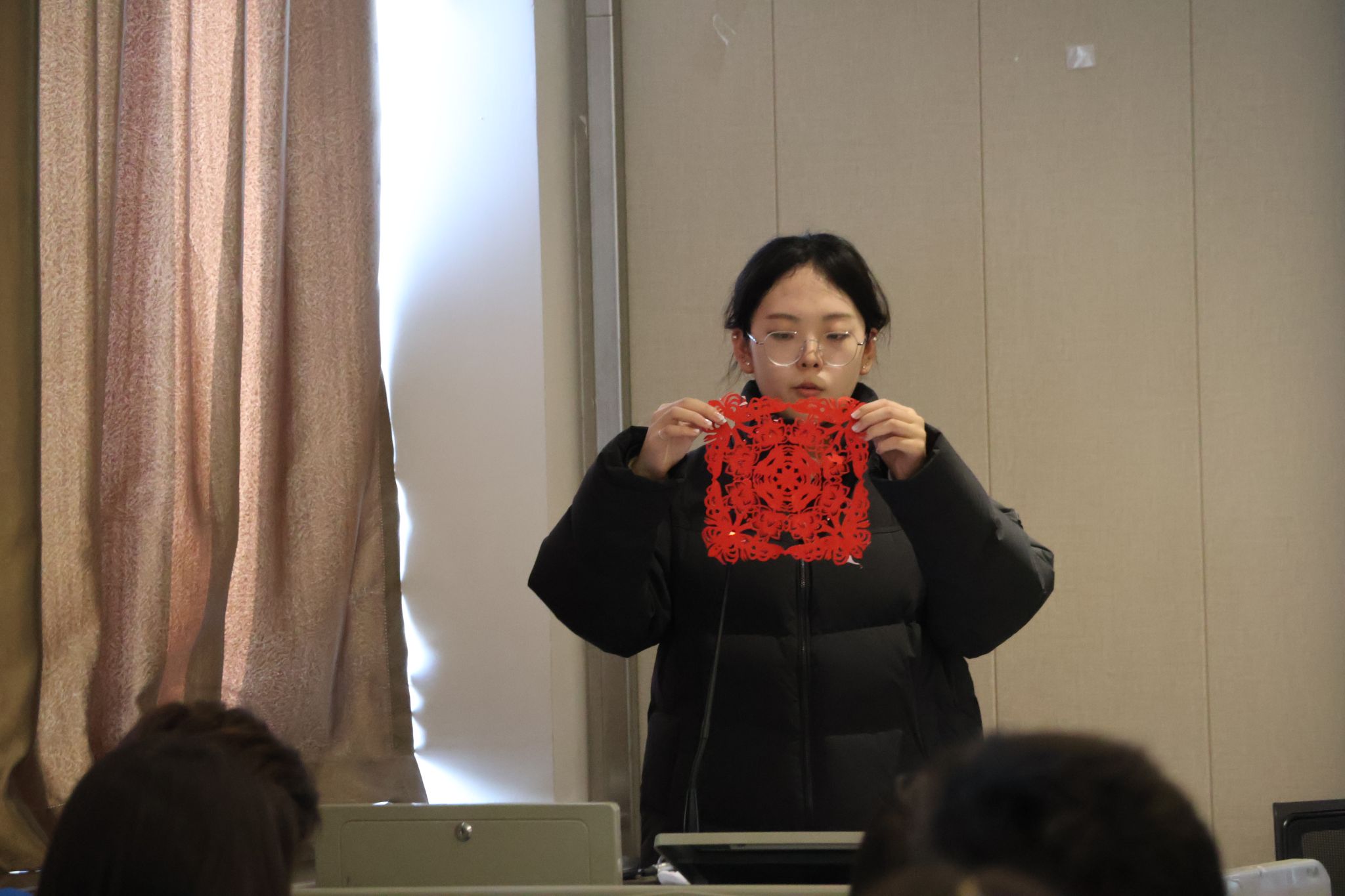 课堂在一段精彩的剪纸艺术视频中拉开帷幕。刘嘉嘉从剪纸的历史起源讲起,沿着时间脉络展开系统讲解:从商周时期金箔纹样的雏形,到汉代造纸术推动其在民间广泛流传;从新疆出土的北朝“对马”“对猴”剪纸残片,到隋唐时期剪纸融入日常生活,再到元代成为人们寄托情感的载体,直至今日成为珍贵的“民族文化活化石”。她还特别介绍了以库淑兰为代表的非遗传承人的感人事迹,展示了“抓髻娃娃”“五谷丰登”等经典纹样,指出这些图案不仅蕴含吉祥寓意,也生动记录了民间生活的真实场景。