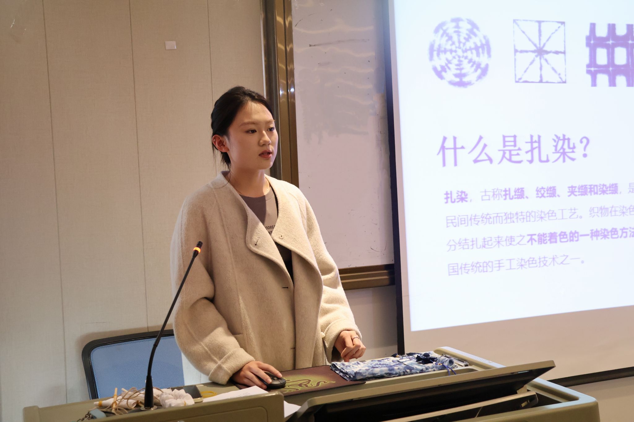 课堂上,黄心蕊为同学们系统讲解了扎染的历史源流与文化内涵:从秦汉时期初现雏形,到唐代“蜀缬”风靡一时,再到宋、明、清各代普及发展、技法日趋多元,扎染不仅是穿越千年的工艺记忆,更成为承载民间审美与地域风情的重要文化符号。她还特别介绍了“民族扎染之乡”大理周城村,那里至今仍延续着传统扎染技艺,让蓝白交织的素雅之美代代相传。课程还讲述了扎染常用的传统染料——以板蓝根为代表的蓝草,其天然环保的特性以及具备的杀菌消炎功效,使同学们深切感受到传统工艺中蕴含的生态智慧与生活哲学。